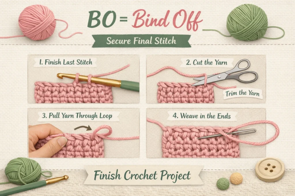 Crochet patterns are full of abbreviations that can feel confusing at first. If you’ve ever followed a pattern and suddenly seen “BO”, you might wonder what it means and what you’re supposed to do next. Don’t worry this is a very common crochet abbreviation, and once you understand it, your crochet projects will become much easier to follow.