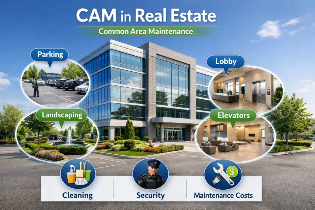 CAM refers to fees tenants pay for maintaining shared areas like hallways, parking lots, and landscaping.