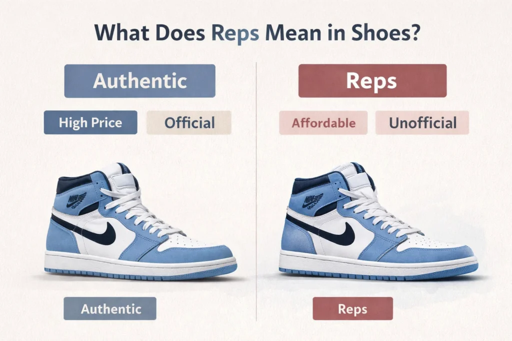 “Reps” in shoes refers to replica sneakers unofficial copies of popular, often expensive or limited-edition shoes that imitate the design of authentic branded footwear.
